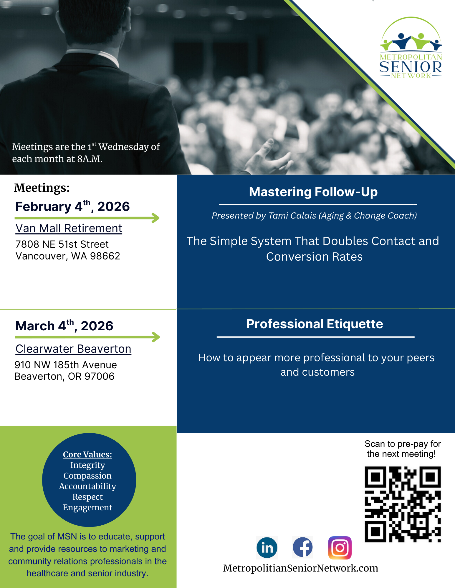 Our mission is to educate, support and connect resources to professionals serving the senior industry. We are the longest running and largest networking group in the quad county area. Most say we are also the friendliest!