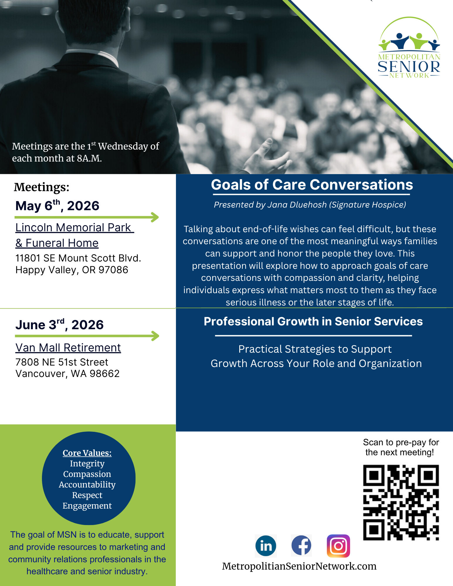 May 06, 2026Lincoln Memorial Park & Funeral Home -- 11801 SE Mount Scott Blvd., Happy Valley, OR 97086Jun 03 Wed Monthly Marketing Meeting (Clark County)