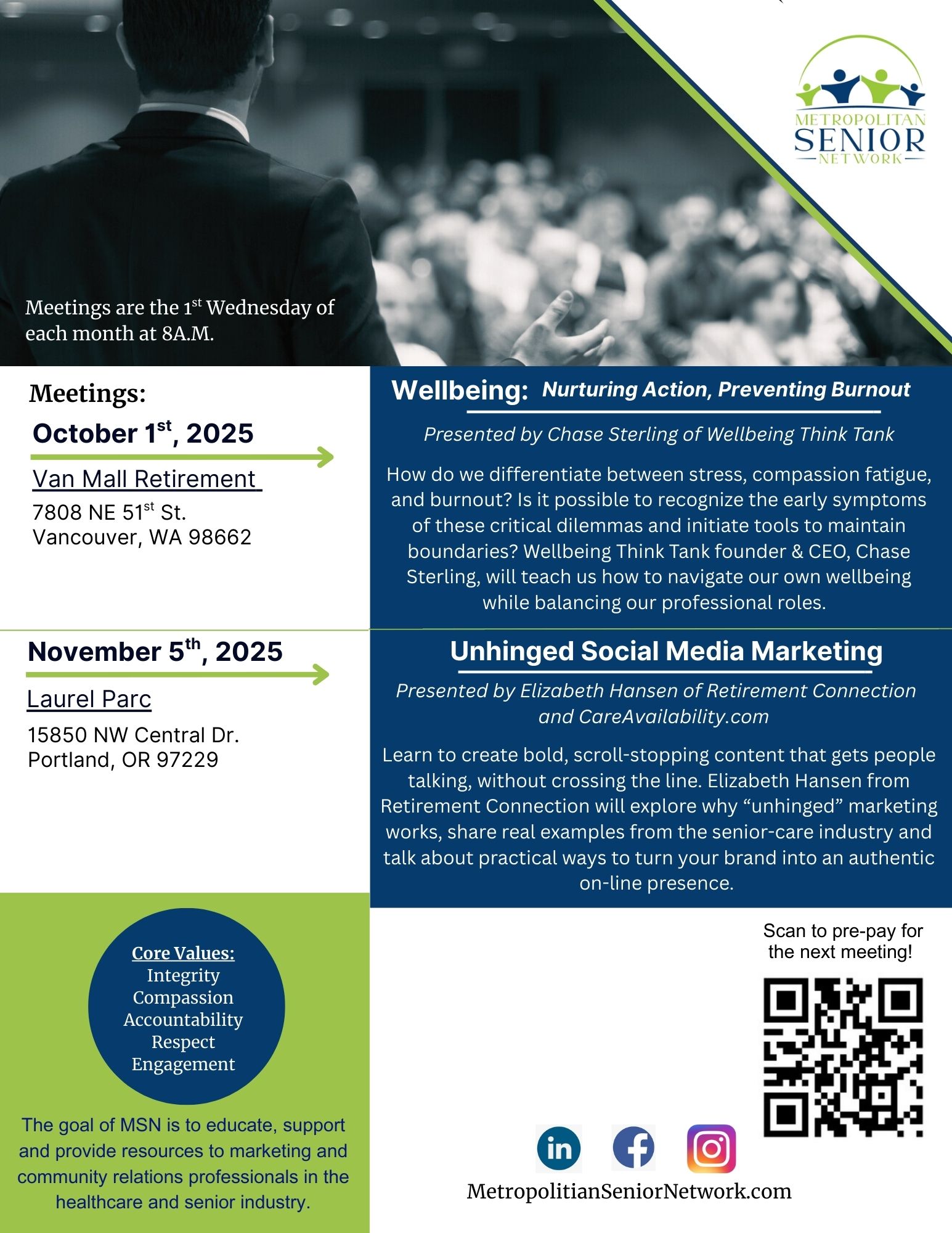Welcome to Metropolitan Senior Network! Our mission is to educate, support and connect resources to professionals serving the senior industry. We are the longest running and largest networking group in the quad county area. Most say we are also the friendliest!